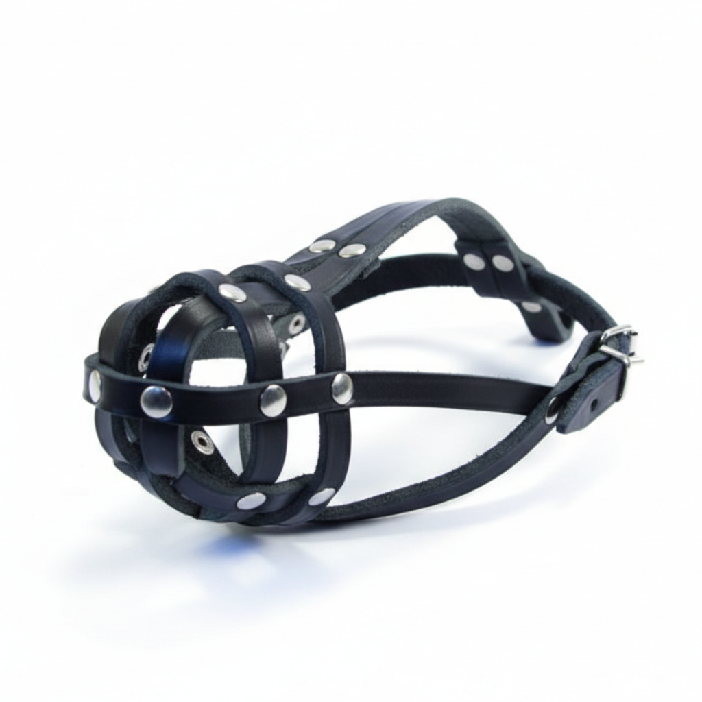 The entire muzzle is made of genuine leather with strong metal rivets to hold it together. The clamps are made of metal with holes in the leather for adjustment.